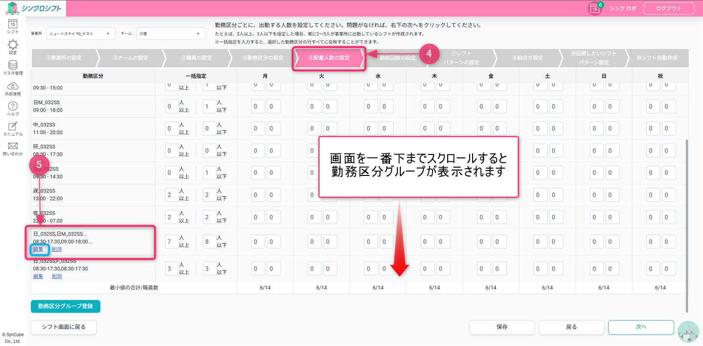 2.シフト自動作成ステップの「⑤配置人数の設定」をクリックし画面を一番下までスクロールします。