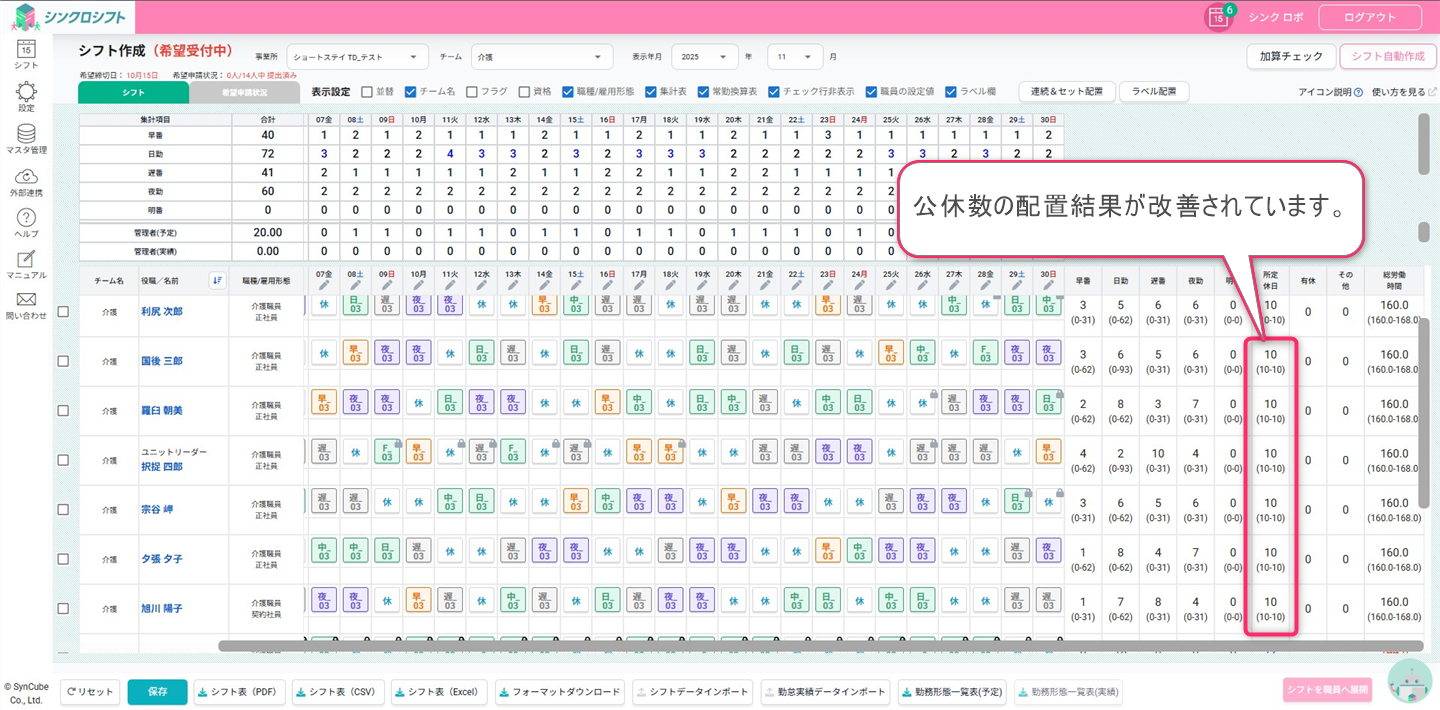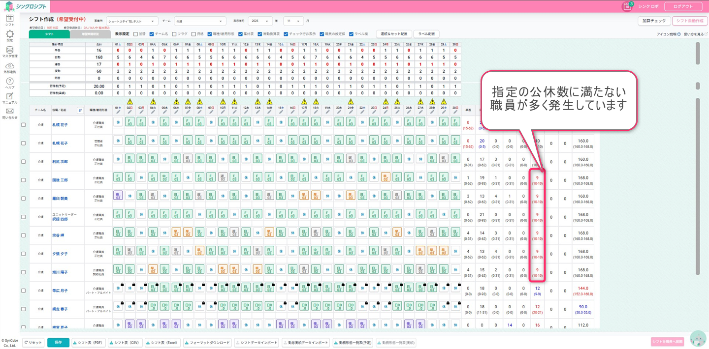 シフト自動作成機能を使って自動作成した結果、特定の職員の公休の回数が指定した公休数に満たないシフト配置が発生することがあります。