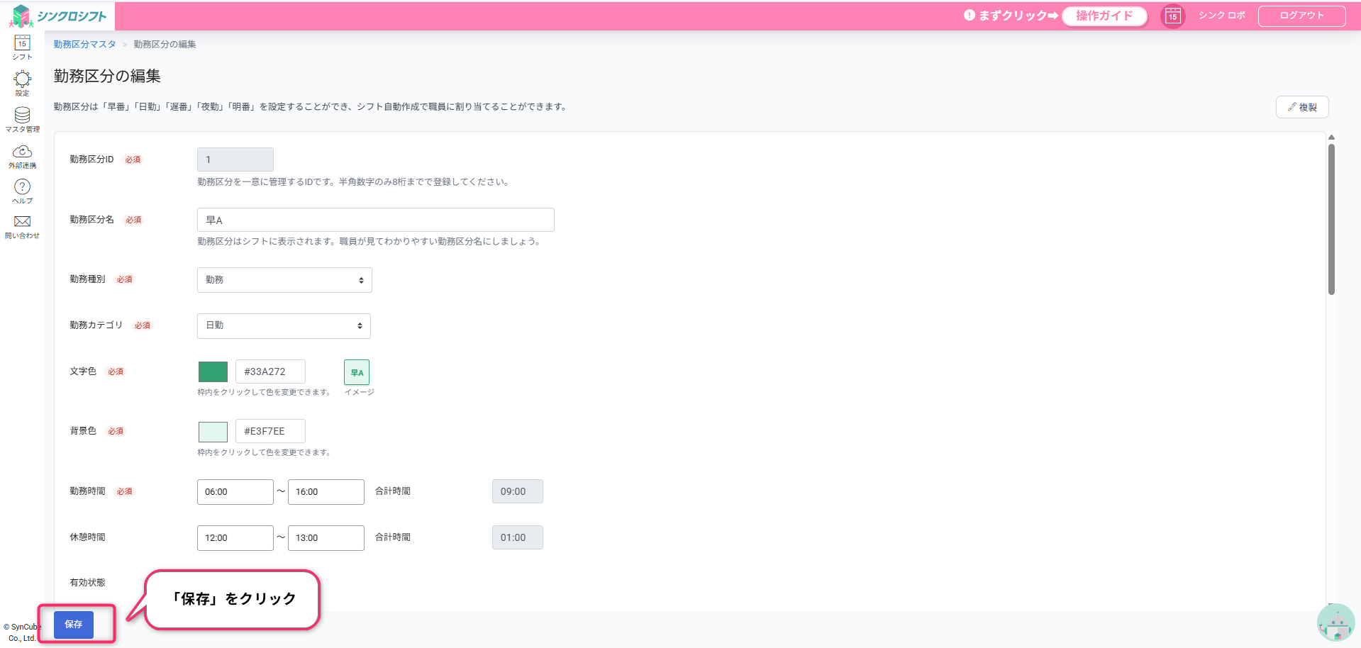 メニュー>マスタ>勤務区分マスタページに移動します。