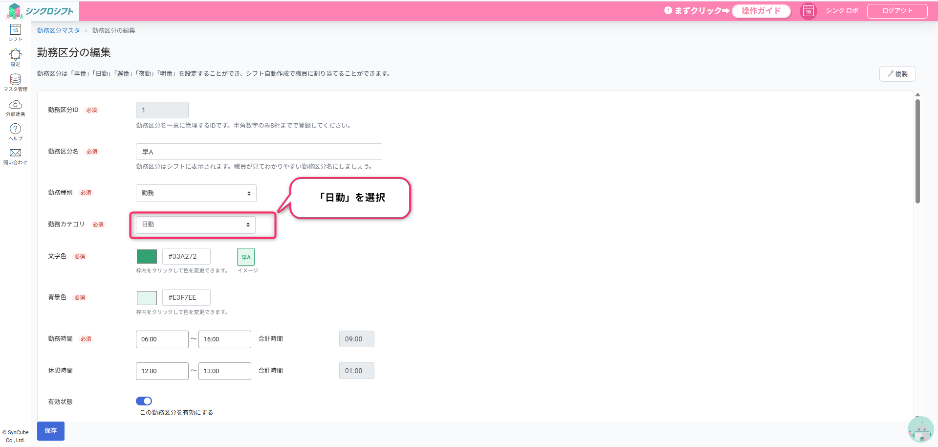 集計部において早番で集計されている勤務区分を日勤で集計できるように変更したい場合は、勤務カテゴリを変更してください。