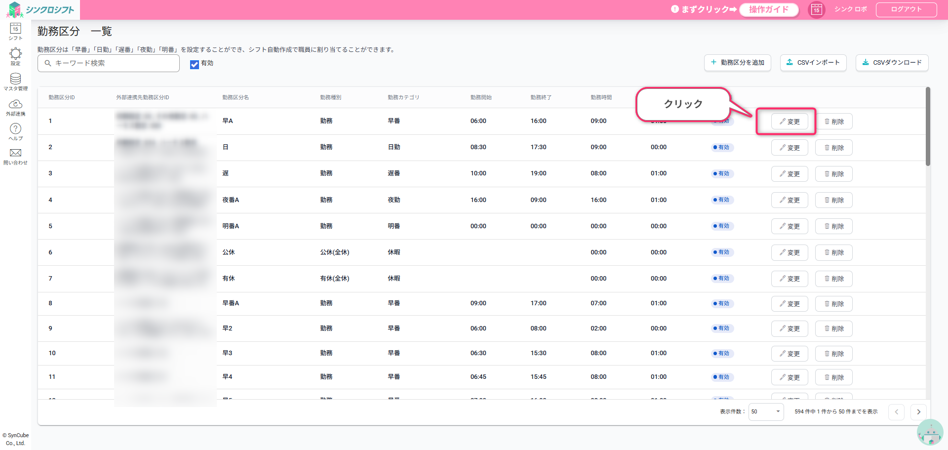 変更したい勤務区分の「変更」ボタンをクリックします。