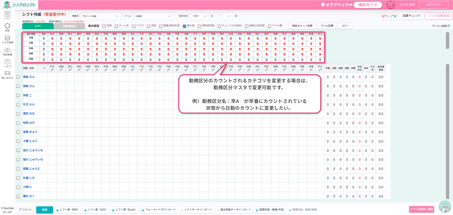 シフト画面の集計部のカウント値は、勤務カテゴリごとに集計しています。