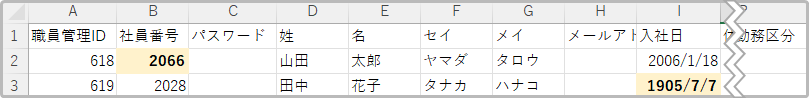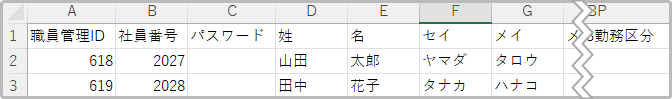 下記は職員管理をCSVダウンロードしたCSVファイルです。
