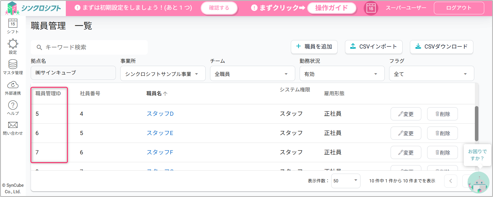 シンクロシフト上の職員は、職員管理IDをキーとして職員情報を管理します。